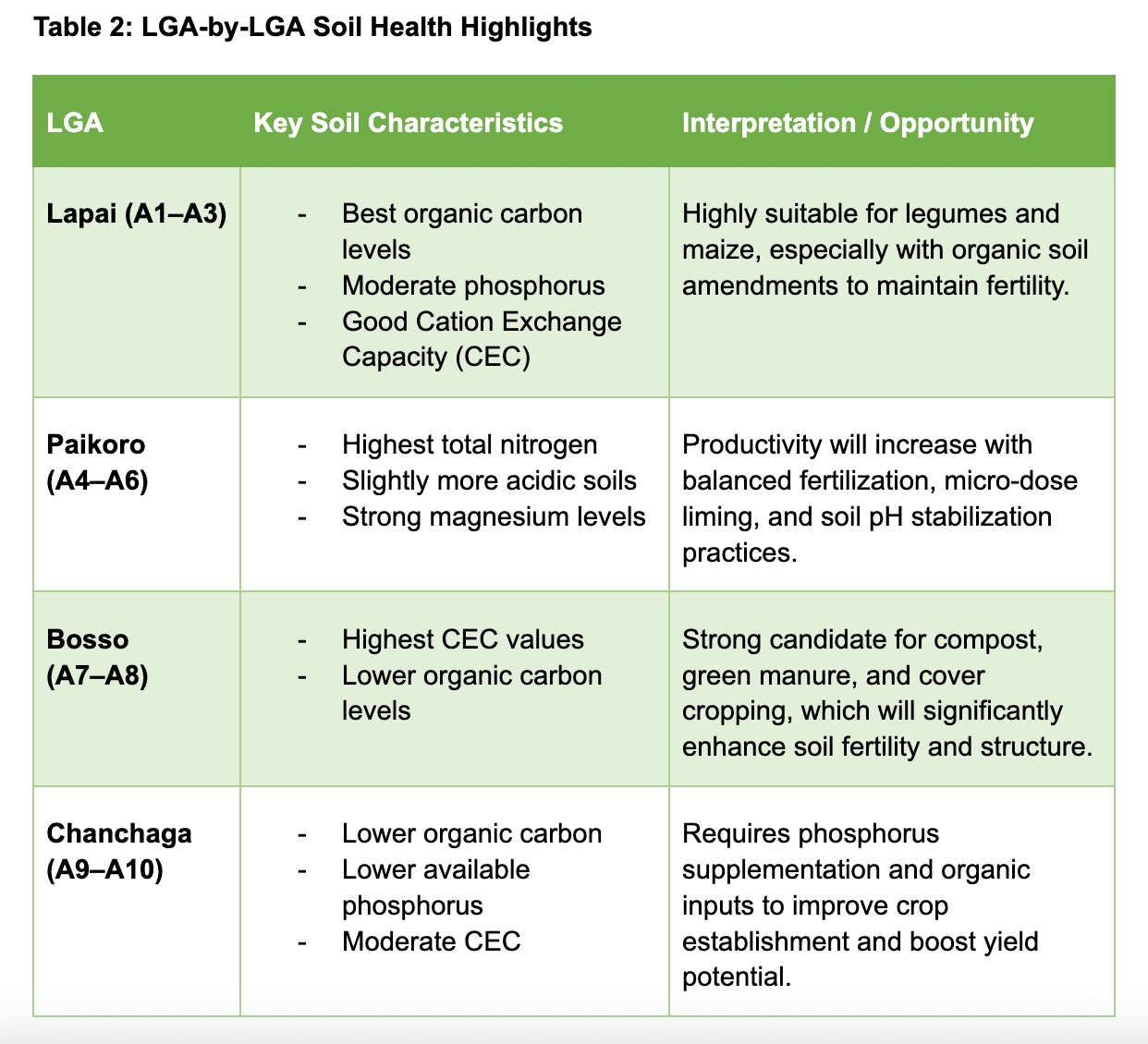 This soil assessment demonstrates that Niger State possesses a strong foundation for agricultural transformation. The soils across Lapai, Paikoro, Bosso, and Chanchaga are workable, moderately fertile, and highly responsive to improvement; conditions that position the state for rapid gains in productivity if supported with strategic interventions. However, the consistently low organic carbon, modest nitrogen levels, and limited phosphorus highlight a clear need for sustainable soil enrichment practices.