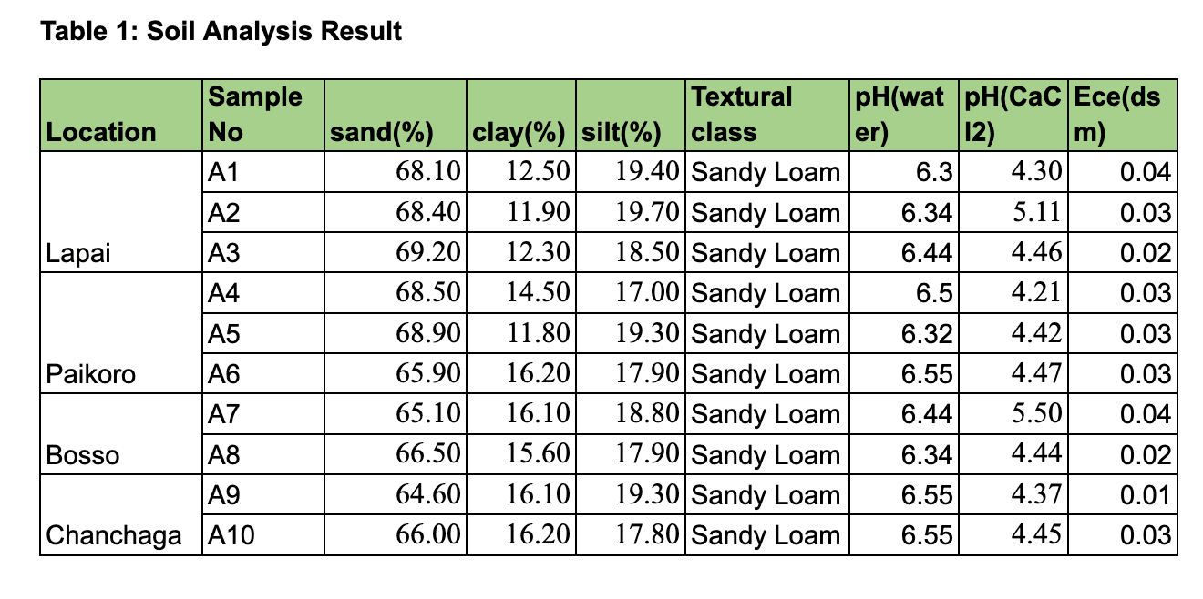 Across all four LGAs, the soil samples consistently exhibited a sandy loam texture—a soil type widely recognized for its excellent drainage yet relatively low nutrient and moisture retention. Subtle variations were observed: samples from Lapai and Paikoro contained slightly higher clay proportions, reaching up to 16.2%, indicating a marginally better ability to hold water and support root development. In contrast, soils from Bosso and Chanchaga displayed similar sandy loam characteristics with moderate silt content, reinforcing a uniform textural profile across the study area. The predominance of sandy loam suggests that these soils are inherently responsive to organic amendments, mulching, manure incorporation, and other climate-smart soil management strategies designed to enhance water-holding capacity and buffer against nutrient loss. Strengthening soil structure through increased organic matter will therefore be essential for improving crop productivity and sustaining long-term soil health in these communities..