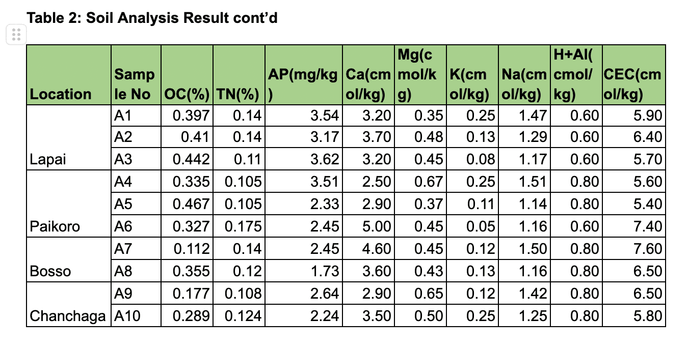 The soil pH (measured in water) across all samples ranged between 6.30 and 6.55, reflecting a slightly acidic environment that remains highly suitable for a wide range of crops, including cereals, legumes, root crops, and vegetables. Paikoro samples showed marginally higher acidity in CaCl₂ measurements (dropping to about 4.21) indicating greater sensitivity to nutrient availability shifts, while soils from Lapai demonstrated more stable pH values. Overall, the acidity levels fall within the optimal range for nutrient uptake and biological activity, suggesting that large-scale liming is unnecessary. However, periodic pH monitoring is recommended to mitigate progressive acidification, especially in areas with intensive cultivation or fertilizer use.